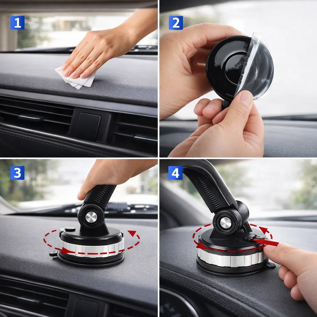 وتقدر تثبّته في أي مكان في السيارة، لأنه مزوّد بقاعدة شفط قوية تعطيك ثبات عالي وتمنع انزلاق الجهاز حتى مع المطبات